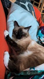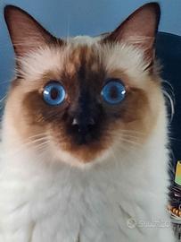 Giovane e bellissimo maschio di due anni, razza Sacro di Birmania, docile e socievole, vaccinato, sano, cerca femmina per accoppiamento. Sempre vissuto in appartamento. La femmina verrà ospitata per il tempo necessario all'accoppiamento.