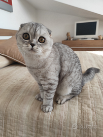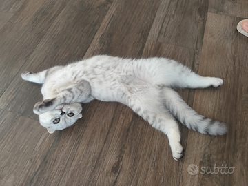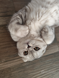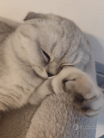 Subito disponibile stupendo gatto scottish fold di circa sei mesi maschio a dir poco bellissimo carattere favoloso molto dolce coccolone si consegna con kit pappa completamente vaccinato fatto antiparassitario sverminati e eseguito test filv felv guardia negativi quindi sano.. non è in regalo