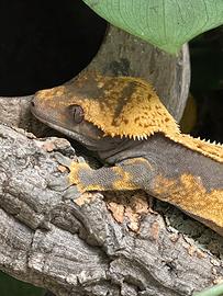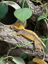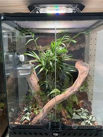Bellissimo esemplare femmina di Geco Ciliatus femmina, morph Harlequin. Carattere molto timido. Terrario Exo terra 30X30X45 allestito con piante e sfagno effetto foresta tropicale, con tane in sughero e radici. Lampada Skylight MID 30 e tappeto riscaldante.