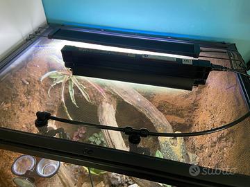 Vendo setup completo per geco ciliatus, tutto incluso, pronto da gestire da subito. Terrario Terratlantis 60x40x60 con sfondo 3D, bioattivo maturo con substrato drenante in argilla espansa, piante vive, collemboli e isopodi già stabilizzati. Geco Ciliatus maschio morph Halloween, circa 1 anno e mezzo, sano, abituato alla gestione. Incluso nel prezzo: - Nebulizzatore automatico 2 ugelli controllabile da app - Lampada UVB Arcadia LumenIze Pro T5 7% 8W controllabile da app - Luce per piante dimmerabile con timer (6/8/10h + notturna) - Arredi completi: tronchi, tane, decorazioni, ciotole con ventosa Valore materiale superiore ai 500€. Vendo tutto insieme a 400€ trattabili. Motivo vendita: mancanza di tempo. Solo acquirenti seri. Esclusivamente ritiro a mano.