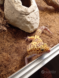 Cedo Geco Leopardiano più relativa teca . La teca è predisposta di tutto !!!!!!! zona calda e umida luci UVB tappetino riscaldato entrambi le tane sfondo 3D termostati ecc ecc