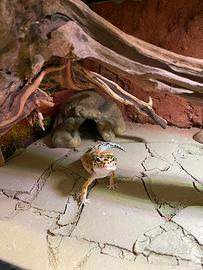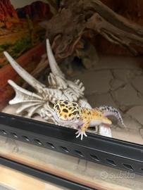 Bellissimo Geco Leopardino maschio, morph Enigma. Età 2 anni circa. Completo di teca Exo terra 60X45X30 illuminazione con due lampade Skylight MID 30, tappeto riscaldante, ciotole Exo terra, due tane calde e una umida. Allestimento terrario pensato appositamente per garantire il benessere dell'animale, di tipo desertico