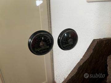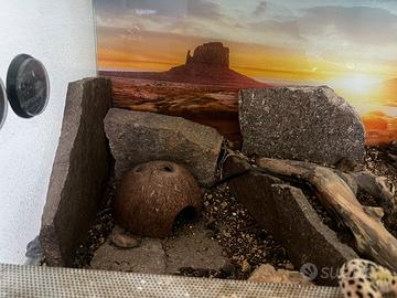 comprende: tappetino riscaldante,termostato,termometro,termometro umidità, tane per il geco, legni.