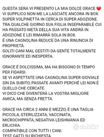 Grace simil volpino taglia piccola cerca una nuova famiglia dove poter essere felice. Descrizione completa nella seconda in foto. Per informazioni contattare Alfonso al numero 3398274942 Associazione Onlus Il Mondo di Anais