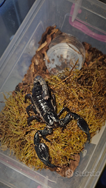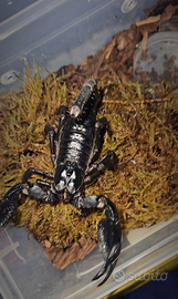 Disponibili stupendi esemplari di Heterometrus silenus,scorpione asiatico di grandi dimensioni, noto anche come "scorpione nero delle foreste". È una specie docile e ideale per i neofiti, originaria del Sud-est asiatico, che si differenzia per le sue chele molto grosse. Disponibili sia maschi che femmine, cedo a 25€ cad. Per maggiori info,foto e video non esitate a contattarmi 3342854973. Sono di libera vendita e detenzione e non richiedono documentazioni CITES