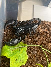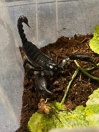 Wildhome2k25 propone : Coppia adulta di scorpioni giganti della foresta asiatica , stupendi esemplari e di una facile gestione, teca di misure minime consigliate 30x30x30 per un singolo esemplare adulto , si cibano principalmente di blatte lateralis , tarme della farina, grilli e caimani, umidità 70-85% .