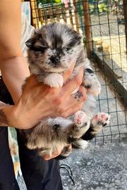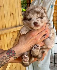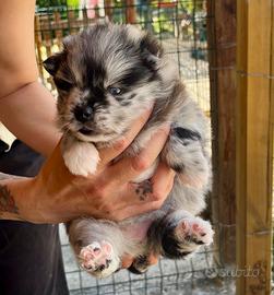 Bellissima cucciolata di pomsky f4 , piccoli miniatura merle , y merle sono rarissimi , restano disponibili un maschio color merlè cioccolato e una femmina color Blue merlè. Entrambi i cuccioli hanno gli occhi azzurri .
