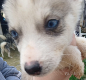 Femmina di husky siberian dal manto grigio e bianco con occhi chiari. Gia sverminata e svezzata. Genitori puri e visibili vivono con noi