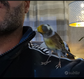 Bellissimo ibrido di 6 mesi allevato completamente a mano canto cardellino, ancora oggi sente solo dischetto 100?il prezzo non è trattabile, scambo solo con Cardellino maschio mayor angestrale taglia grande.