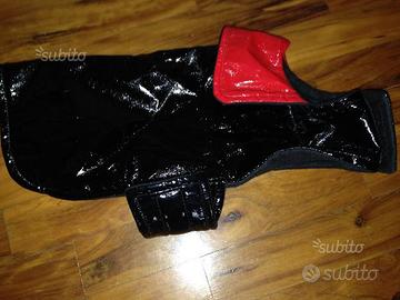 Delizioso impermeabile lucido in finta pelle nera avvolgente torace e addome con bavero risvoltato in rosso e doppia chiusura in velcro a passaggio sottoaddominale e sottocollo per consentire un comodo adattamento; interno in caldo pile nero opaco. Disponibile da 25 cm da misurarsi a partire dalla collottola fino alla base della coda dell'animale.