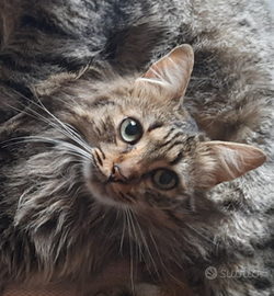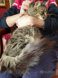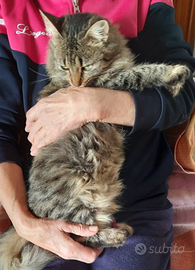 Piumetta è una gattina di dieci mesi sterilizzata, vaccinata, sverminata e trattata regolarmente con gli antiparassitari. E' tigrata-maculata e ha il pelo lungo e morbidissimo con una bella coda folta. E' fiduciosa, fa subito le fusa, sale in braccio, le piace giocare con le palline e i piccoli peluche. Le piace essere spazzolata. E' una gattina dolce e delicata, è cresciuta coi suoi quattro fratellini al riparo e ha imparato a usare la lettiera, ma siamo stati costretti a fine estate a liberarla in giardino perché in casa ci sono altri gatti, anche se adesso che fa freddo tendiamo a farla stare a casa di notte... e poi lei preferisce non uscire più. Quando esce temiamo soprattutto che venga investita, anche se non si allontana molto, grazie anche alla sterilizzazione. Vorremmo farla adottare da una famiglia che abbia già avuto esperienza con gatti e che possa tenerla prevalentemente in casa al sicuro.