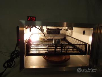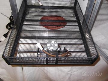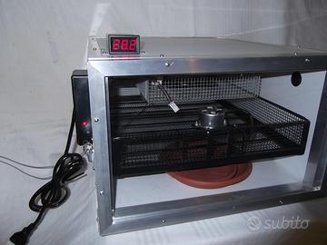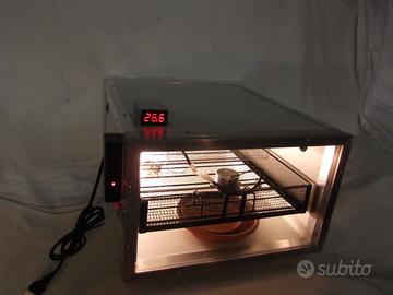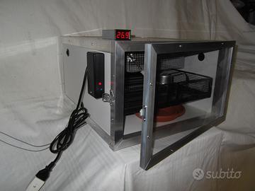 Vendo incubatrice 50 uova, nuova automatica, con due anni di garanzia, costruita con pannelli di bilaminato isolato, rifinita con angolari di alluminio, portina in policarbonato trasparente e telaio in alluminio, cestello con griglia in metallo verniciato completo di motoriduttore per girare le uova in automatico, controllo della temperatura elettronico e regolabile (al dm di grado °C) termometro digitale a display rossi due vaschette per l'acqua.