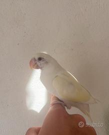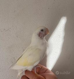 Cedo pappagallo inseparabile roseicollis allevato a mano (attualmente prende 2 pappate al giorno e già inizia a mangiare il panico), mutazione cremino (bianco con leggere sfumature gialle sulla schiena ed occhi rossi), leggermente più grande rispetto al gemello nel altro mio annuncio, inizia già a fare i primi voli, abituato al contatto umano sin da piccolo, foto dei genitori visibile nell'ultima foto, solo persone realmente interessate!