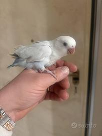 Cedo inseparabile di due mesi allevato a mano e quasi a fine svezzamento prende ancora un imbeccata al giorno e lo cedo per 35€ Contattare al numero 3804726845