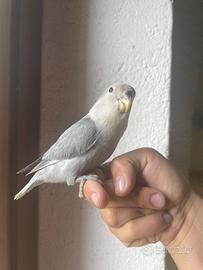 Pappagallo inseparabile allevato a mano color grigio, colorazione molto rara. Appena svezzato e molto docile.