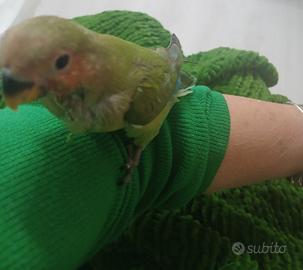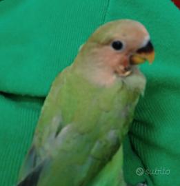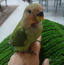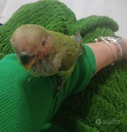 Dolcissimo inseparabili allevato a mano ultimo dei 4 nati docilissimo ha 48 gg pronto per nuove famiglie Colore verde mascherina arancione fa parte della famiglia dei rosaccollins Offro serietà e correttezza Solo ritiro a mano