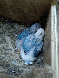 Vendesi pulli di inseparabili di Fischer in regola con certificazione CITES. I soggetti in vendita sono i pulli nei nidi ovvero i due più grandi di colore blu figli di madre grigia e padre blu e quelli ancora senza piumaggio figli di madre verde e padre giallo. Le altre foto sono dei genitori. I pulli non sono sessati e non sono allevati a mano anche se abituati a stare a contatto con l'uomo.