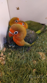 Dolcissimi inseparabili Fischer, allevati a mano e in fase di svezzamento avanzata.