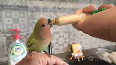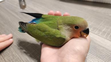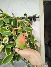 Pullo inseparabile allevato a mano sin dal 15esimo giorno di vita, già svezzato, abituato al richiamo, genitori in ultima foto.