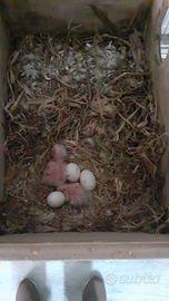 Cedo fantastica e bellissima coppia di inseparabili Roseicollis attualmente genitori di questa splendida covata. Cedo tutto in blocco genitori e pulli. Prezzo da concordare in vista e piaciuta.