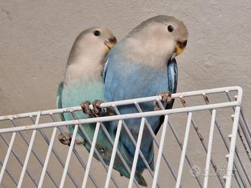 1 femmina torquoise e 1 maschio colbalto di sei mesi. Non allevati a mano ma abituati a stare fuori dalla gabbia e a venire sulla spalla. Più un piccolo di 3 mesi non sessato colorazione cobalto