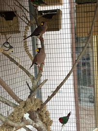 Una voliera esagonale con tetto, una gabbia cova da 120 e numerose gabbiette.
