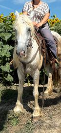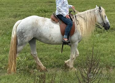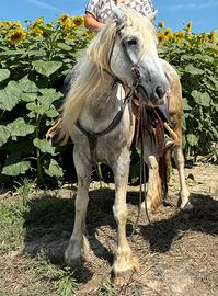 Cavalla Irlandese nata ad Aprile 2017, altezza 1.55m, colore grigio, sta già scolorendo verso il bianco. Ottimo carattere, abituata ad uscire in passeggiata con principianti, ma adatta anche a cavalieri più esperti. Abituata a diversi tipi di percorsi, ottima testa, piede sicuro.