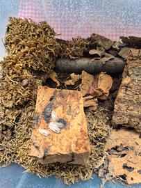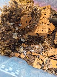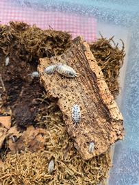 Colonia starter: 10 esemplari varie dimensioni I Porcellionides pruinosus, o semplicemente "pruinosus", sono una specie di Isopodi (crostacei terrestri) molto apprezzata in terraristica, in particolare per i terrari bioattivi. Sono originari di regioni calde e aride, il che li rende più tolleranti a condizioni meno umide rispetto ad altre specie. La loro caratteristica distintiva è il corpo allungato e leggermente appiattito, spesso ricoperto da una sottile "polvere" cerosa (da cui il nome comune "polverosi") che può dare loro una colorazione che varia dal grigio-blu al marrone rossastro. Sono noti per la loro velocità e la loro natura attiva, il che li rende interessanti da osservare. Nei terrari bioattivi, i Porcellionides pruinosus svolgono un ruolo ecologico fondamentale come detritivori. Si nutrono di foglie morte, legno in decomposizione, avanzi di cibo non consumati dagli animali principali e feci, contribuendo in modo significativo a: Pulizia del substrato: Riducono l'accumulo di detriti organici, prevenendo la formazione di muffe e batteri nocivi. Ciclo dei nutrienti: Decompongono la materia organica, rilasciando nutrienti che possono essere riassorbiti dalle piante presenti nel terrario. Aerazione del substrato: Il loro continuo scavare aiuta a mantenere il substrato aerato e sano. Grazie alla loro robustezza, al tasso di riproduzione elevato e alla loro efficienza come "squadra di pulizia", i Porcellionides pruinosus sono una scelta eccellente per quasi tutti i tipi di terrari bioattivi, contribuendo a un ecosistema equilibrato e autosufficiente.