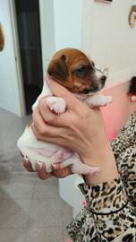 Si prenota ultimo cucciolo di jack Russell maschio nato il 15 marzo. Il cucciolo rispecchia lo standard puro dei jack Russell,zampa corta con peso della mamma e del papà inferiore ai 5,5 kg. Il cucciolo si cedera' con sverminazione,primo vaccino e regolare vendita con micro cip.