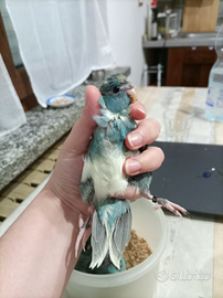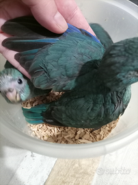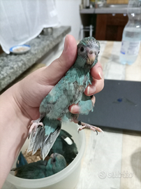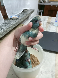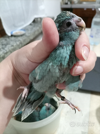 Cedo a fine svezzamento tre giovani kakariki blu pezzato regolarmente anellati.