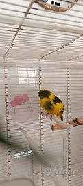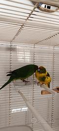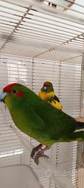 Coppia riproduttiva di pappagalli Kakariki, maschio verde e femmina pezzata, molto belli. Non allevati a mano, di carattere tranquillo, fanno pochissimo rumore e sono adatti anche per appartamenti. Sono anellati a norma di legge. Volendo li vendo anche con la loro gabbia grande: chiedo 70 per la coppia e 100 per la coppia più gabbia e accessori come si vede in foto.