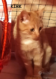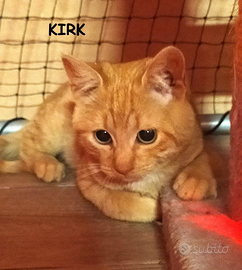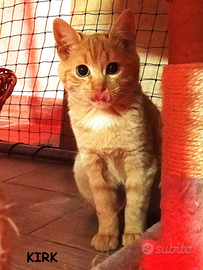 Io sono Kirk! Mi chiamo come il biondo capitano dell'Enterprise di Star Trek perche' sono un combattente di grandissimo livello!! Mi hanno recuperato in una cuccia digiuno da giorni a causa di un forte raffeddore che non mi faceva piu' sentire gli odori ... aspettavo solo di morire, ma come il mio omonimo, nelle situazioni di difficolta' , ho tenuto duro in attesa che qualcuno con la telepatia e il teletrasporto, corresse a trovarmi... e cosi' e' stato!!! All'improvviso un angelo ha aperto il telo di questa cuccia e mi ha visto li' inerme e da quel momento tutto e' cambiato per me, calduccio infinito , lampada a infrarossi, pappe buone e cure per farmi tonare al mio splendore.. sono sempre un comandante!!!! Adesso cerco una nuova astronave da gestire che abbia divani, tiragraffi, cucce, palline e tanto tanto amore per me... chi vuole fare parte del mio equipaggio????