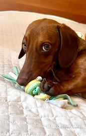 Un bassotto nano marrone focato di 1 anno e 5 mesi, basso di zampe ma alto di amore.