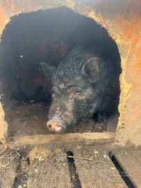 Vendo a malincuore maialino nano femmina di 1 anno, per cambio casa e purtroppo non posso portarla con me, ha un carattere docile, intelligente ed anche molto furba, ascolta e ti segue ma delle volte fa come vuole lei, in quei casi la convinci con una mela, la cedo anche col suo mangime apposito per mini Pig di 17 chili + altri 10 chili
