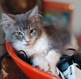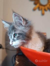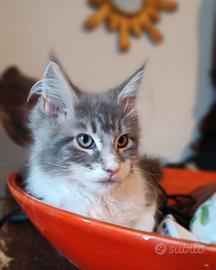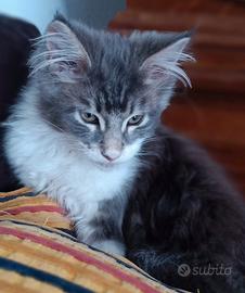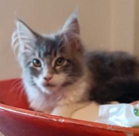 Privato vende, micio Main Coon maschio silver, senza pedigree, di tre mesi, lunghezza dalla base del collo alla base della coda 39 cm peso 2,8 kg, zona Milano, figlio di Queen 7,8 kg e King 9,5kg i due miei gattoni Main Coon, chiedo 500 euro,