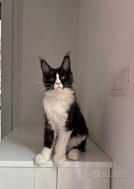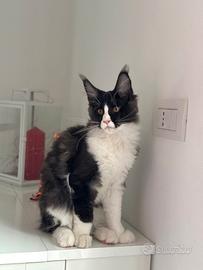 Maine Coon maschio di colore Black Smoke & White di mesi 4 genitori testati per malattie genetiche. Viene ceduto con pedigree Anfi da compagnia (obbligo di sterilizzazione) libretto sanitario vaccini sverminato microchip passaggio di proprietà. Cresciuto in ambiente familiare a contatto con persone e altri gatti adulti già educato a lattiera tiragraffi e gattaiola. Super coccolone richiede molto contatto umano ama dormire accanto alle persone. Per altre info contattare 3389936991 Chiara 3385829720 Diego Visitate su Google il ns Allevamento Adorabili Zampette