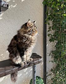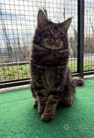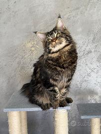 Un gigante stallone di razza Maine Coon dal mantello color black blotched è disponibile per monta/accoppiamento.