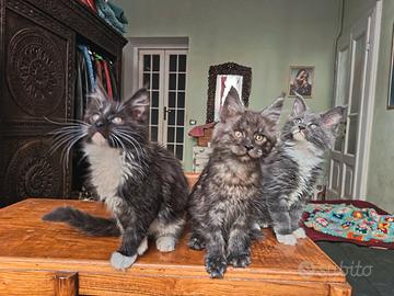 Cucciola simpaticissima di Maine Coon con pedigree . Dolcissimia e coccolona perche cresciuta in casa con amore (no gabbie!) a contatto con persone,bambini,cagnolini e abituati a bagnetto e rumori domestici. I genitori hanno tutti i test genetici a posto e gli ecocardio perfetti (l'ultimo recente) Ed hanno lines di single prestigiose ma per la vostra tranquillità viene data una garanzia di un anno sulle malattie della razza.possibilita di pedigree aperto ad allevatori, persone in attesa di affisso o competenti.genitori in foto