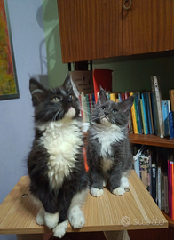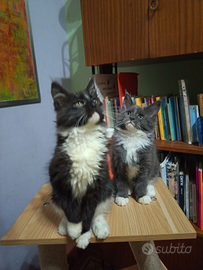 Maine Coon cream cuccioli con pedigree .Vivaci e teneroni, vivono in casa (no gabbie!) a contatto con persone,bambini,cagnolini e abituati al bagnetto e ai rumori domestici. I genitori hanno tutti i test genetici a posto e gli ecocardio perfetti ma per la vostra tranquillità viene data una garanzia di un anno sulle malattie della razza. Dispinibili un maschio black Smoke, un maschio black smoke+ white, una femmina blu smoke + white.