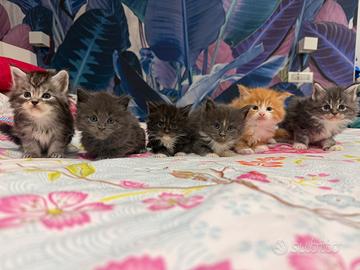 Meravigliosi cuccioli Maine Coon, 2 maschi e 3 femmine del mio allevamento con affisso "Heart Queen Frida" Pedigree AGI Nascita: 18/02/2026 Colore: maschi 1 black and white , 1 red and white, femmine 1 blu solida e 1 blu and white e 1 blu tabby and white . Genitori: Tutti test N/N e ecocardio ok Padre: Domus Oram GDavid Bowie Madre: Country Sator Melitea DISPONIBILI con contratto da COMPAGNIA. I cuccioli saranno disponibili verso fine Maggio, quindi dalle 14 settimane di vita e saranno consegnati con ciclo vaccinale trivalente completo , sverminazione, antiparassitario e pedigree AGI wcf. Genitori con test genetici N/N ed Ecocardio nella norma! I cuccioli vivono a stretto contatto con noi, i nostri bimbi e i nostri cagnolini...saranno quindi già abituati a vivere in situazioni analoghe. Sono quindi cuccioli molto socializzati e dolci!! Possibilità di consegna in LOMBARDIA, EMILIA-ROMAGNA, MARCHE, ABRUZZO, LAZIO, PIEMONTE, VENETO...per tutte le altre zone vedremo di trovare insieme una soluzione!! Si prega di contattarmi tramite whatsapp al num 3496378261 Grazieeeeeeee!!!