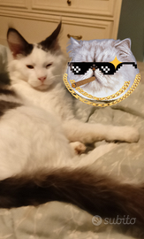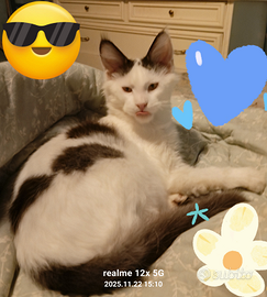 Allevamento amatoriale cede cucciolo Maine Coon bianco e nero Harlequin di 7 mesi. Il cucciolo viene ceduto al rimborso spese. È vaccinato con vaccino trivalente, ha microchip inserito. Essendo un cucciolo con molto bianco È stato abituato fin da piccolo ad essere lavato frequentemente ed asciugato con il phon e il soffiatore. Per ulteriori informazioni contattare il numero presente nell'annuncio. Astenersi perditempo. Viene richiesto rimborso spese.