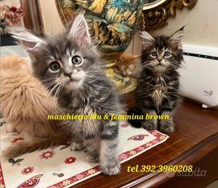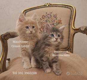I gattini che potete vedere sfogliando le foto ed altri sono disponibili da subito e a breve nei colori CREAM, BLU, RED TORTIE, BROWN sia maschietti che femminucce. I gattini nascono e crescono in casa amatorialmente, con esperienza nel settore dal 1998, in presenza dell' allevatrice, di una bambina, di due cagnolini e degli altri gatti Maine Coon di varie età (la bisnonna Grande Campionessa Internazionale ha 14 anni). Socievoli ed abituati all' uso della lettiera possono raggiungere la nuova famiglia identificati da MICROCHIP, VACCINATI, TRATTATI PER I PARASSITI, CON CERTIFICATO VETERINARIO ATTESTANTE LA BUONA SALUTE e