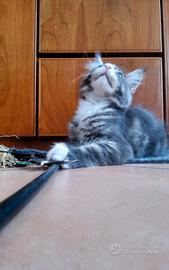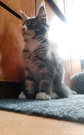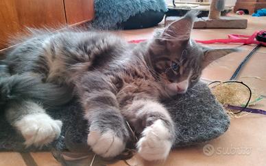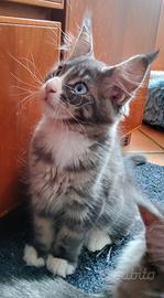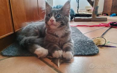 Solo per veri amanti della razza Splendido Cucciolo Maine Coon Maschio con Pedigree Il nostro allevamento amatoriale dispone di un meraviglioso cucciolo di Maine Coon maschio, nella raffinata colorazione Blue Tabby with White, Blue Eyes. Nato ad inizio gennaio è una vera "nuvola" di pelo semilungo grigio con un adorabile effetto "frisé". Il bianco candido dei calzini, dei "guantini" e del musetto gli dona un'eleganza senza pari. Il piccolo è il vero "Re" di casa: cresce in un ambiente familiare, socializzato con amore a stretto contatto con umani e altri gatti. Il bianco sul musetto è distribuito in modo impeccabile e speculare, donandogli un'espressione dolce, armonica e di grande tipicità. Svezzato con alimentazione di alta qualità. Entrambi i genitori sono: Testati per le malattie genetiche della razza (HCM, PKD, SMA) con esito negativo. Sottoposti regolarmente a screening ecocardiografico ed eco renale (esiti nella norma). Il cucciolo sarà pronto per entrare nella sua nuova famiglia dopo i 3 mesi di vita garantendo così il corretto svezzamento e la socializzazione. Verrà ceduto con: Pedigree Libretto Sanitario con vaccinazioni trivalente -microchip Contratto di cessione da compagnia. Cerchiamo per lui una famiglia consapevole e amorevole. Primo contatto gradito via chat per una breve presentazione. Solo se veramente interessati