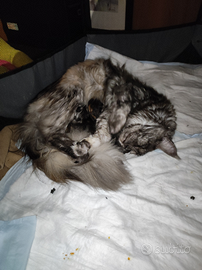 Sono nati da pochi GG 4 splendidi cuccioli di Maine coon tre femmine e 1 maschietto verranno ceduti al compimento del 3 Mese di età sverminati vaccinati con pedigree Enfi.i genitori sono visibili in casa con noi, esenti da malattie genetiche,con ecocardio regolare. Si valuta cessione con pedigree da riproduzione