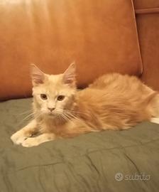 Maine Coon Cream Silver Gabby blotched, maschio, 8 mesi con pedigree alta genealogia, disponibile da subito. Vivace e tenerone, vissuto in casa (no gabbie!) a contatto con persone,bambini,cagnolini e abituato a bagnetto e rumori domestici ha sviluppato un carattere equilibrato ed affettuoso. I genitori hanno tutti i test genetici a posto e gli ecocardio perfetti ma per la vostra tranquillità viene data una garanzia di un anno sulle malattie della razza. Il gatto ha un bel profilo e può essere ceduto anche con pedigree aperto. Con contratto da compania verra' ceduto sterilizzato.