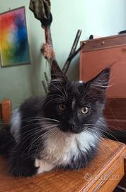 Maine Coon Black Smoke con Bianco, Pedigree Alta genealogia, maschio, 4 mesi mezzo con pedigree disponibile da subito. Un vivace tenerone, vissuto in casa (no gabbie!) a contatto con persone,bambini,cagnolini e abituato a bagnetto e rumori domestici. I genitori hanno tutti i test genetici a posto e gli ecocardio perfetti ma per la vostra tranquillità viene data una garanzia fino al complimento di un anno sulle malattie della razza. Possibilita' di pedigree aperto . Con contratto da compania verra' ceduto sterilizzato.