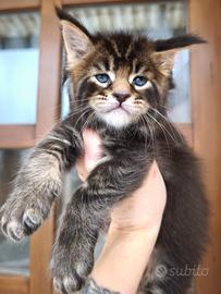 Disponibile splendido cucciolo di razza Maine Coon black ticked tabby, nato il 22 gennaio, pronto a raggiungere la nuova famiglia da fine aprile.
