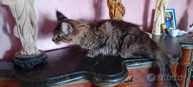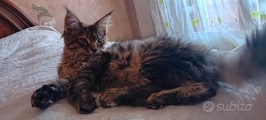 Maine coon americana XXL 4 mesi di 3,8 kg , cresciuta in casa e abituata a lettiera e tiragraffi, doppio ciclo vaccinale e antiparassitario, libretto sanitario e pedigree W.C.F. discendenza da generazioni di campioni mondiali, i nostri cuccioli prendono i primi primi posti alle mostre feline, genitori visibili ed esenti da malattie genetiche hcm n/n ecocardio regolare e non portano nessuna mutazione genetica, 3395462826 (a richiesta possibilità di consegna a domicilio)