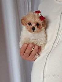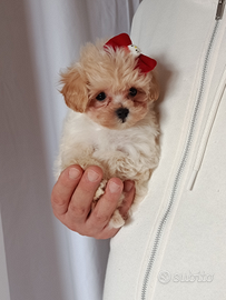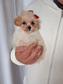 Disponibile meraviglioso cucciolo di maltipoo di taglia piccolissima, stimato da adulto 1,500 kg. Viene ceduto a 3 mesi d'età con libretto sanitario, 2 vaccinazioni, ciclo vermifugo completo, certificato veterinario di buona salute. I genitori, mamma maltesina coreana e papà barboncino mini toy red, hanno entrambi pedigree e certificati genetici. Per informazioni è gradito un primo contatto telefonico al 3276738736. IL COSTO È MOLTO ALTO!!!
