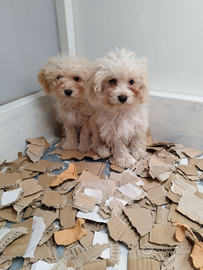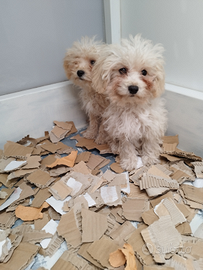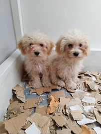 Disponibili in sede cagnolini maschi razza maltipoo toy varietà crema e albicocca chiaro molto affettuosi giocherelloni e soprattutto intelligente papà barboncino toy albicocca mamma maltese linea americana cuccioli nati e cresciuti in ambiente familiare il 20-08-25 quindi di oltre 90 giorni